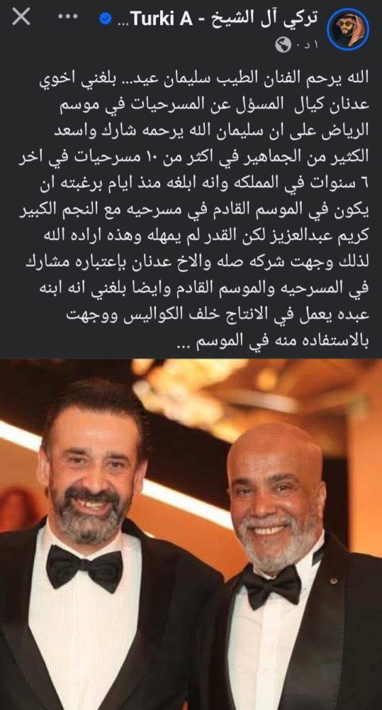 وتابع تركي آل الشيخ: تواصل الراحل سليمان عيد قبل وفاته مع المسؤول عن المسرحيات في موسم الرياض، وأبلغه برغبته بالمشاركة في الموسم الجديد في مسرحية مع النجم المصري كريم عبدالعزيز، لكن القدر لم يمهله.