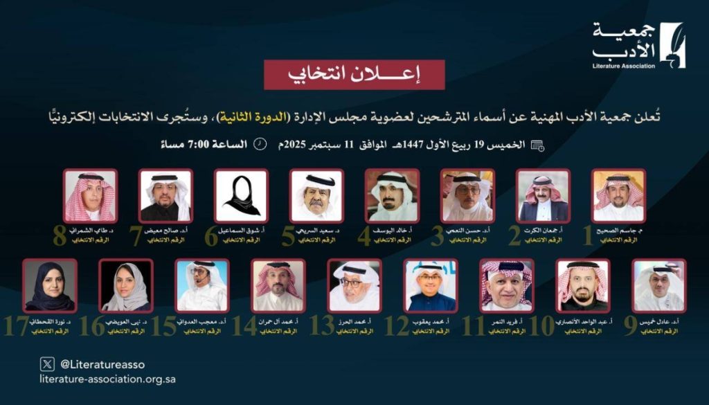 علمت «عكاظ» أن جمعية الأدب أجرت انتخابات اختيار مجلس إدارتها للدورة القادمة، ونال الدكتور سعيد السريحي الثقة برئاسة مجلس إدارة الجمعية، والدكتور حسن النعمي نائباً له، وعضوية كلٍ من الدكتور معجب العدواني، والدكتور عادل خميس، والدكتورة نهى العويضي، والدكتورة نورة القحطاني، وخالد اليوسف، وجاسم الصحيح، ومحمد إبراهيم يعقوب، وينتظر المجلس المصادقة من القطاع غير الربحي.