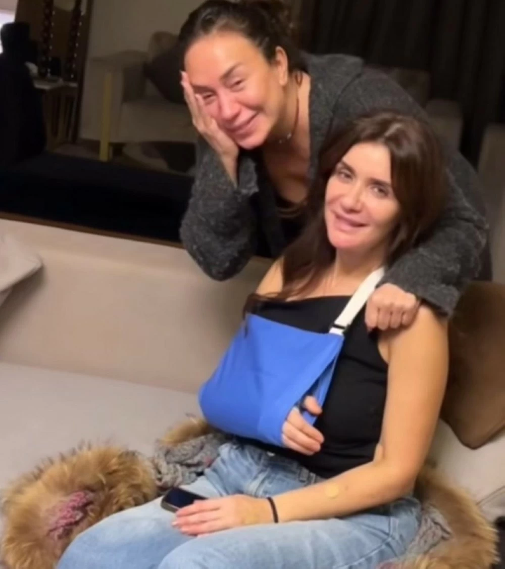 Engy posted a picture of herself with Ghada Adel, who appeared with her arm in a splint hanging from her chest, and commented: “Playing with dogs.”