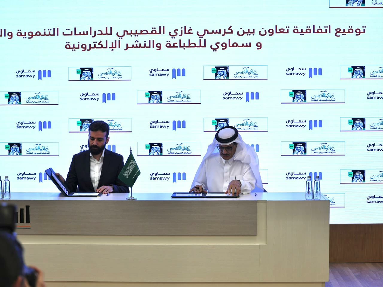 The Ghazi Al-Qusaibi Chair for Developmental and Cultural Studies at Al-Yamamah University has signed a cooperation agreement with the Samawi platform for the scientific, cultural printing, publishing, and distribution of its publications through electronic, paper, and audio channels, contributing to the enhancement and sustainability of knowledge content dissemination.