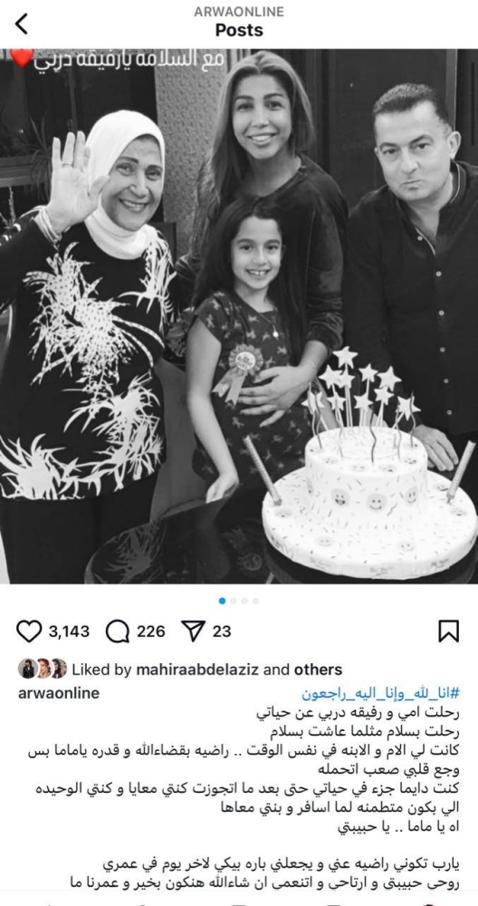 ووثقت أروى، مجموعة من الصور المنوعة التي جمعتهما، أرفقتها برسالة حزينة قالت فيها: «رحلت أمي ورفيقة دربي عن حياتي، رحلت بسلام مثلما عاشت بسلام، كانت لي الأم والابنة في نفس الوقت، راضية بقضاء الله وقدره يا ماما بس وجع قلبي صعب أتحمله».