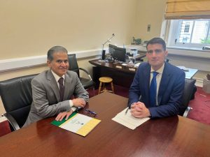 استقبل وزير الدولة للبيئة والمناخ والاتصالات والنقل الإيرلندي جاك شامبرز اليوم (الخميس) القائم بالأعمال بالنيابة لدى سفارة المملكة في إيرلندا عبدالسلام بن عبدالله المشيطي. وجرى خلال الاستقبال استعراض العلاقات الثنائية بين البلدين، وتبادل وجهات النظر حول الموضوعات ذات الاهتمام المشترك.