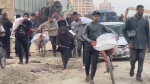 في ظل النقص الشديد للغذاء في قطاع غزة، حصل بعض الأهالي على أكياس مساعدات وحملوها على ظهورهم وعلى الدراجات النارية في أثناء سيرهم في شوارع مدينة غزة المدمرة. اعلانسارع المئات من سكان مدينة غزة إلى إحدى نقاط توزيع المساعدات الغذائية. وأظهرت صور وفيديوهات الناس وهم يحملون أكياس الدقيق والمواد الغذائية…