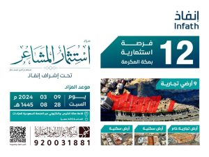 تعلن شركة أعمال الجود العقارية وبإشراف مركز الإسناد والتصفية «إنفاذ» وبحكم من محكمة الأحوال الشخصية وبقرار من محكمة التنفيذ، عن إقامة مزاد «استثمار المشاعر» الهجين يوم 09 مارس 2024 حضوريًا في مكة المكرمة – قاعة مكة الكبرى بحي النسيم – الساعدة 4:00 عصرًا، وإلكترونيًا عبر منصة السعودية للمزادات. يعرض المزاد…