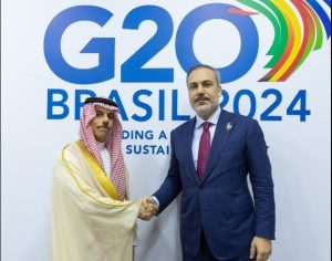 التقى الأمير فيصل بن فرحان بن عبدالله، وزير الخارجية، اليوم الخميس، نظيره التركي هاكان فيدان، وذلك على هامش اجتماع وزراء خارجية دول مجموعة العشرين في مدينة ريو دي جانيرو البرازيلية.وجرى خلال اللقاء، استعراض العلاقات الثنائية، وسبل تعزيزها وتطويرها في شتى المجالات، بالإضافة إلى مناقشة مستجدات القضايا على الساحتين الإقليمية والدولية،…