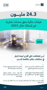 فرضت وزارة التجارة غرامات مالية بلغت 24.3 مليون ريال خلال العام 2023م بحق منشآت غير ممتثلة لنظام مكافحة التستر. وأقرت لجنة النظر في مخالفات نظام مكافحة التستر 850 مخالفة، تمثلت في: استخدام المنشأة حساباً بنكياً آخر غير الحساب العائد لها في تعاملاتها الخاصة وأنشطتها الاقتصادية، واستخدام غير السعودي حساباً بنكياً…