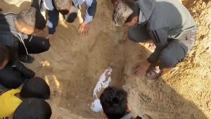 اضطُر عدد من الفلسطينيين اليوم الأربعاء إلى دفن ذويهم في مقابر مؤقتة بالقرب من مستشفى ناصر في خان يونس بسبب خطورة الحركة وسط اشتداد المعارك بين مقاتلي حركة حماس الفلسطينية والجيش الإسرائيلي. اعلانشوهد الأهالي وهم يحفرون في الطريق العام لدفن جثامين من بينهم أطفال من ذويهم. وأمرت إسرائيل السكان بمغادرة جزء…