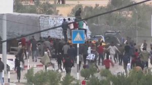 فلسطينيون أنهكهم الجوع وشحّ المؤن يتعلقون بأطراف شاحنة مساعدات دخلت معبر رفح اعلانشهد معبر رفح حالة من الازدحام الشديد، حول شاحنات تحمل مساعدات إنسانية دخلت من مصر إلى قطاع غزة المحاصر.واعتلى بعض الأشخاص تلك الشاحنات التي عبرت مدينة رفح الحدودية في قطاع غزة يوم الأحد، وألقوا المساعدات للنازحين في الشوارع…