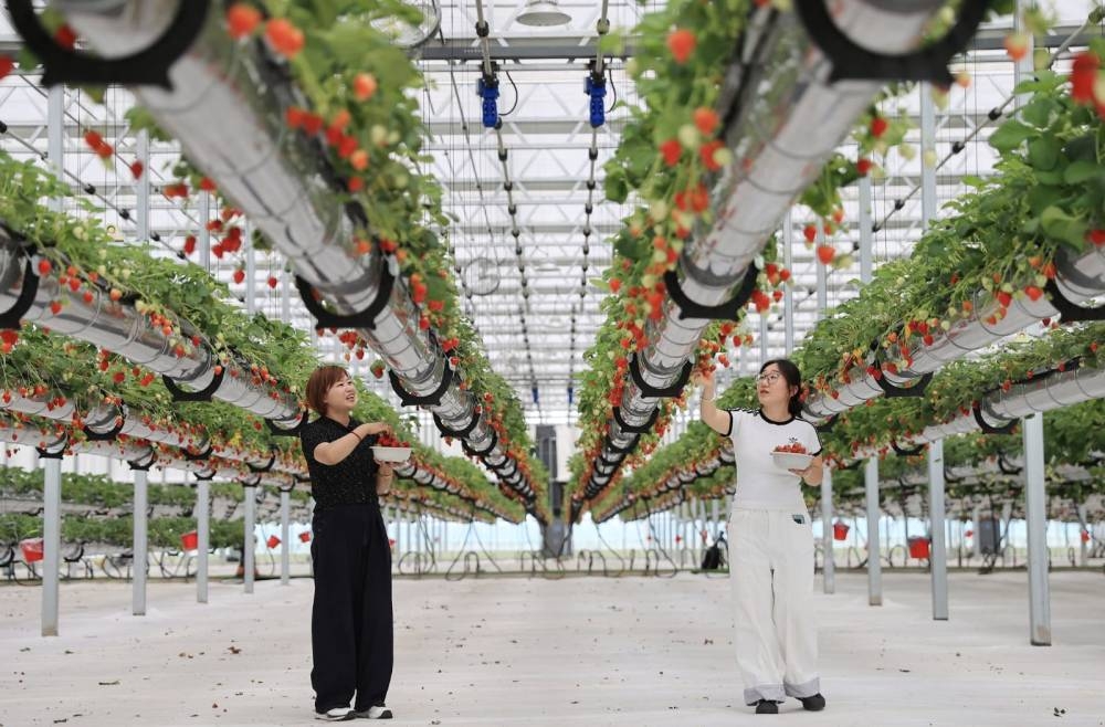 في قاعدة قطف الفراولة في مدينة دونغ ينغ بمقاطعة شاندونغ الصينية، تنمو الفراولة في الهواء من خلال الزراعة دون تربة والزراعة ثلاثية الأبعاد وتكنولوجيا إنترنت الأشياء؛ الأمر الذي يجذب السياح والزائرين. وفي الصورة زائرتان تقطفان حبات الفراولة في المدينة. (إيكونومي دايلي الصينية)
