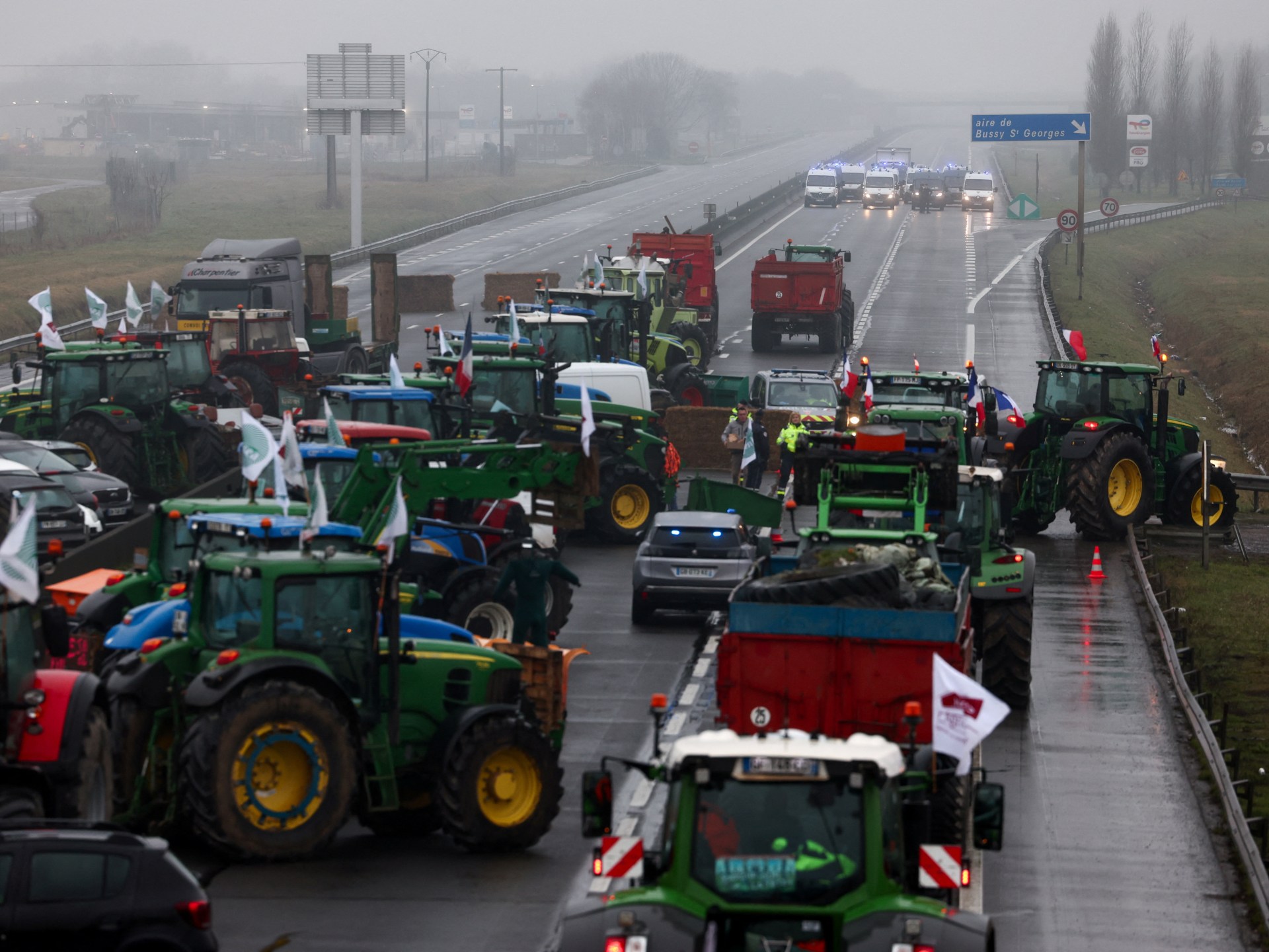 وبدأ حصار باريس، الاثنين، عندما أغلقت مئات الجرارات الزراعية الطرق الإستراتيجية الثمانية المؤدية إليها، وبعد محاولات عديدة، تمكن بعض المحتجين من اقتحام منطقة تخزين في السوق الدولي الأربعاء، مما أدى إلى اعتقال 91 منهم.