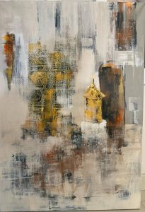 يجسد الفنان التشكيلي عبدالله منير القثامي في هذه اللوحة مشهداً روحياً من الحرم المكي بأسلوب تجريدي تعبيري، يمزج بين دفء الألوان الذهبية والرماديات مع تدرجات لونية تمنح العمل بعداً زمنياً وروحياً. تتداخل ملامح كسوة الكعبة بخطوطها العربية المذهبة مع مقام إبراهيم، في معالجة فنية توازن بين التفاصيل التراثية والتعبير الحر،…