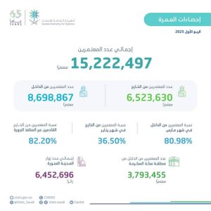 كشفت الهيئة العامة للإحصاء في نشرتها اليوم، إحصاءات العمرة للربع الأول من عام 2025، التي أشارت نتائجها إلى أن إجمالي عدد المعتمرين بلغ 15,222,497 معتمرًا، شكّل السعوديون منهم ما نسبته 24%، فيما بلغت نسبة الذكور 60.5% مقابل 39.5% للإناث. وأظهرت نتائج النشرة أن عدد المعتمرين القادمين من الخارج بلغ 6,523,630…