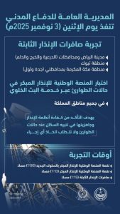 تطلق عند الواحدة ظهراً المديرية العامة للدفاع المدني اليوم (الإثنين) (3 نوفمبر 2025) صافرات الإنذار الثابتة في مناطق الرياض وتبوك ومكة المكرمة، بالتزامن مع اختبارات المنصة الوطنية للإنذار المبكر في جميع مناطق المملكة.وتشمل التجربة تشغيل صافرات الإنذار في محافظات منطقة تبوك، إضافة إلى محافظتي جدة وثول بمنطقة مكة المكرمة ومحافظات…