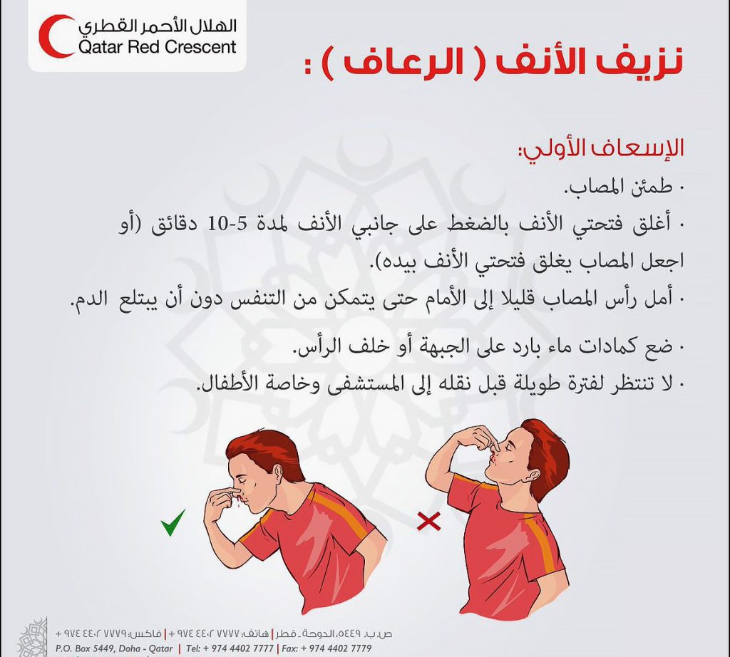 وأوضحت الرابطة أنه يمكن إيقاف نزيف الأنف من خلال القيام بالإسعافات الأولية التالية: