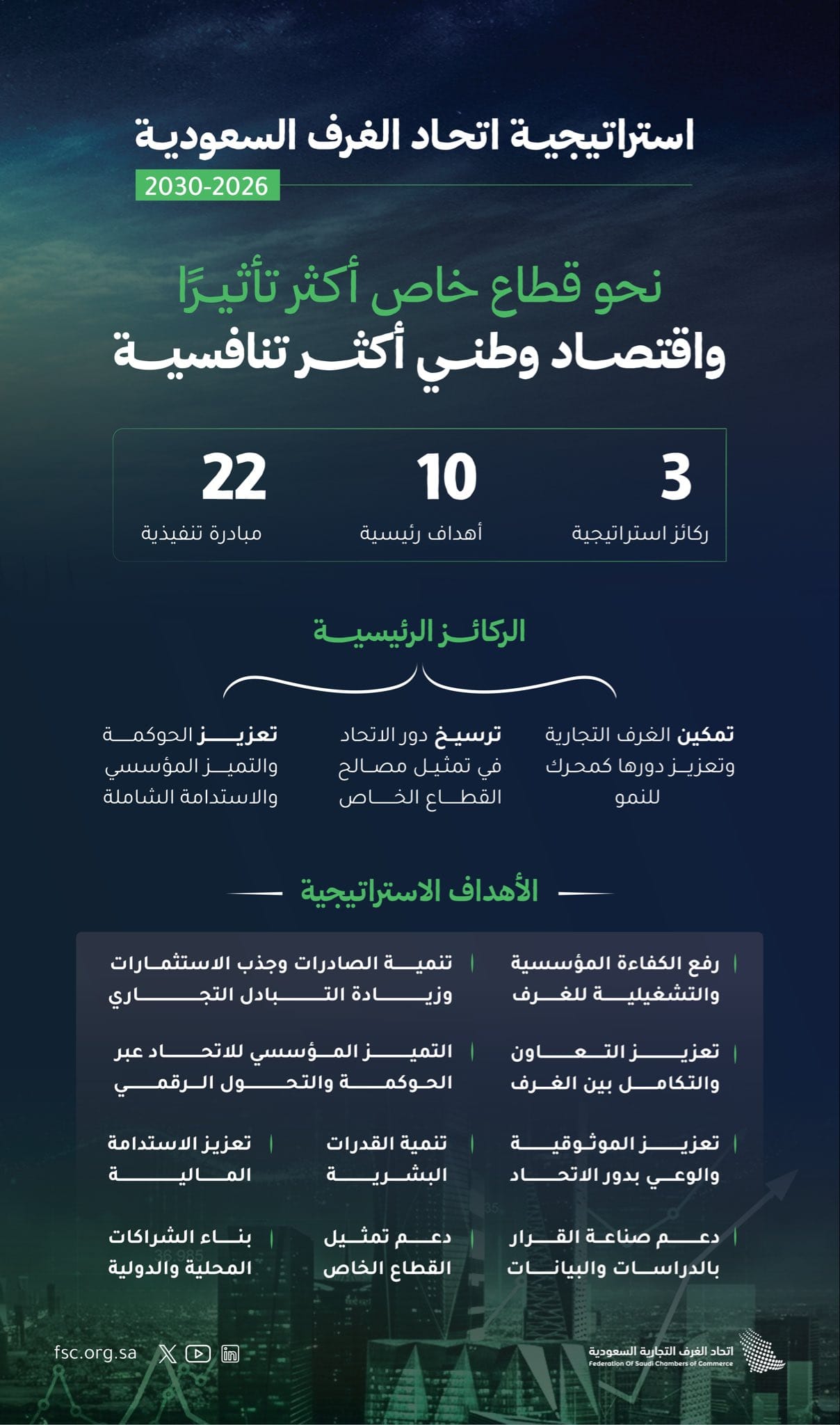 أطلق اتحاد الغرف السعودية استراتيجيته للفترة (2026–2030)، في خطوة نوعية تهدف إلى تعزيز تنافسية القطاع الخاص، ورفع كفاءة منظومة الأعمال، وترسيخ دور القطاع الخاص كشريك رئيسي في تحقيق مستهدفات رؤية السعودية 2030.