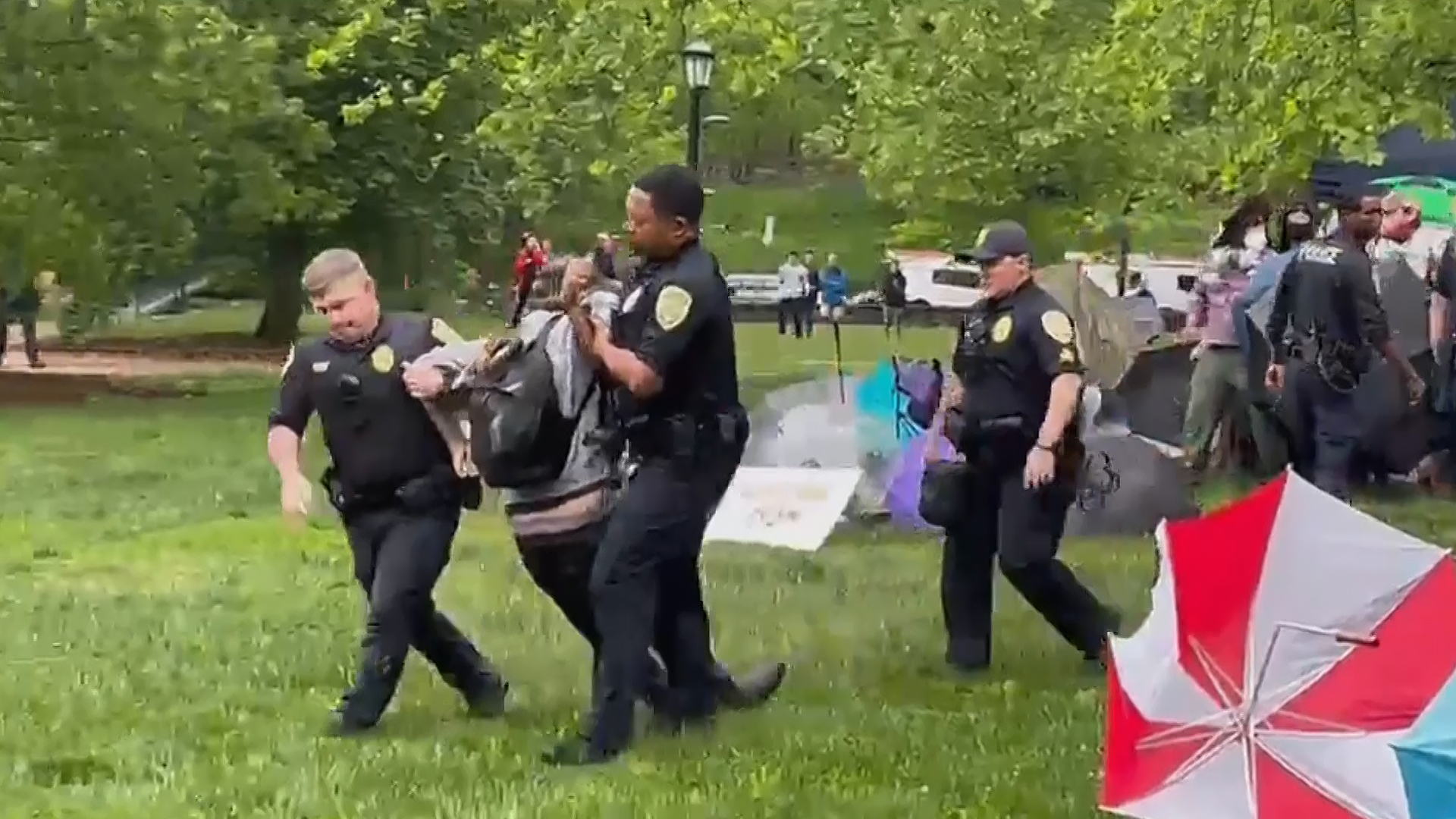 وفي نفس الجامعة، أعاد طلاب متضامنون مع القضية الفلسطينية نصب خيام في الحرم الجامعي، وذلك بعد يومين من فض الشرطة اعتصامهم السابق.