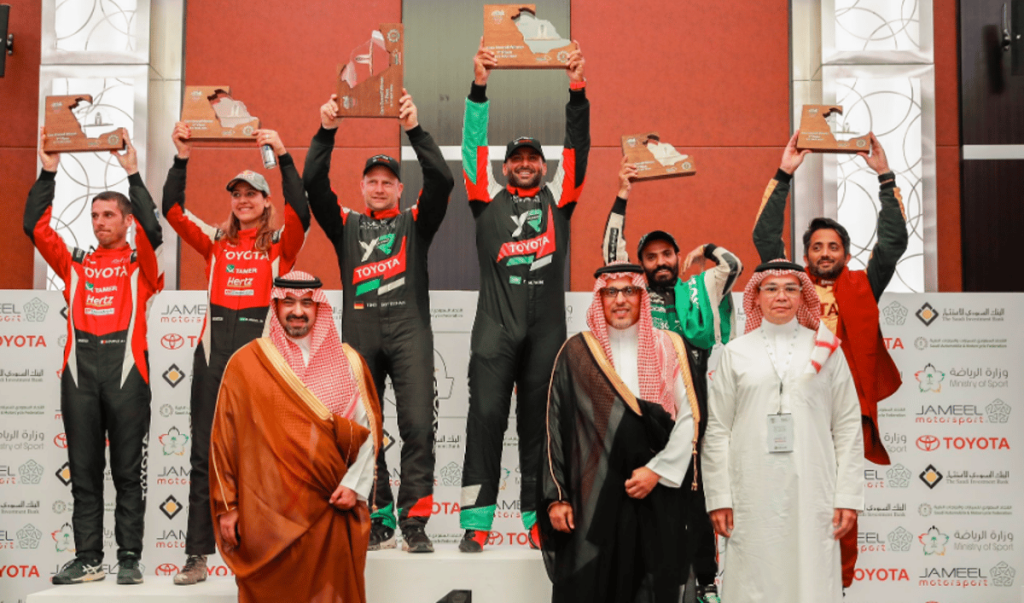 برعاية الأمير فهد بن سلطان بن عبدالعزيز أمير منطقة تبوك، توج الأمير خالد بن سعود بن عبدالله بن فيصل بن عبدالعزيز نائب أمير المنطقة اليوم، الفائزين بـ “رالي تبوك تويوتا 2024″، ضمن الجولة الثانية من بطولة السعودية تويوتا للراليات، بحضور صاحب السمو الملكي الأمير خالد بن سلطان بن عبدالله الفيصل رئيس مجلس إدارة الاتحاد السعودي للسيارات والدرجات النارية، وذلك بقاعة الاحتفالات بفندق جراند ميلينيوم.