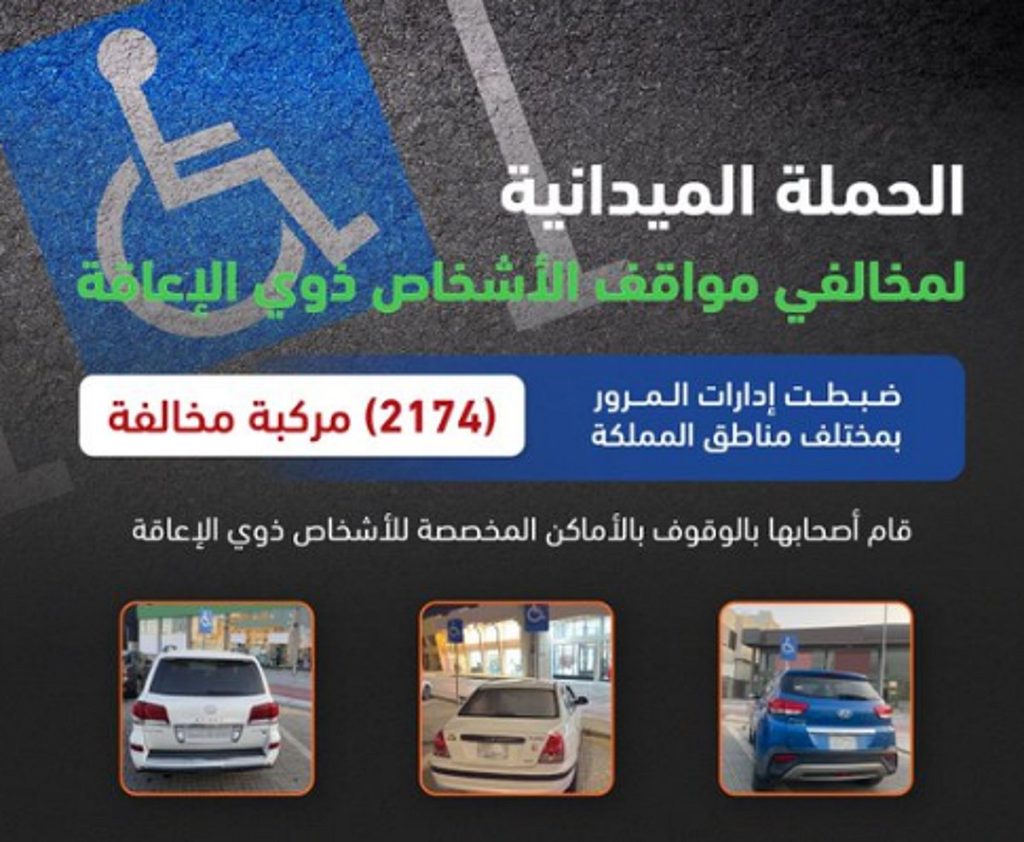وكشف «المرور السعودي» عبر حسابه بمنصة «إكس»، عن ضبط 2174 مركبة مخالفة، بمختلف مناطق المملكة، قام أصحابها بالوقوف بالأماكن المخصصة للأشخاص ذوي الإعاقة.