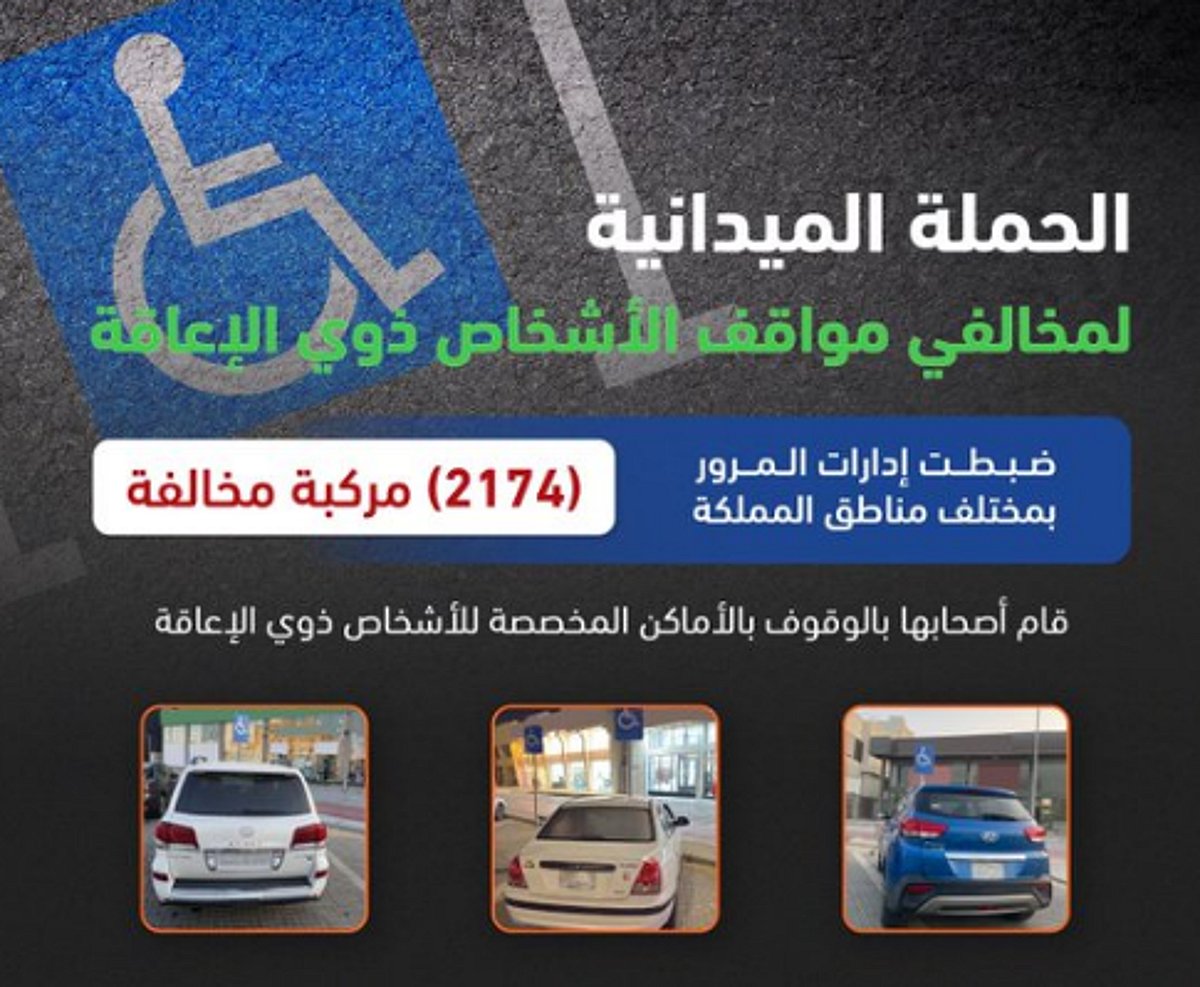 يأتي ذلك ضمن العمل الميداني المستمر الذي تقوم به إدارات المرور في جميع مناطق المملكة لضبط المركبات المخالفة ومن ضمنها التي تقف في الأماكن المخصصة لهذه الفئة وتهيب إدارات المرور الجميع بالتعاون والالتزام بالقواعد الواردة في نظام المرور.