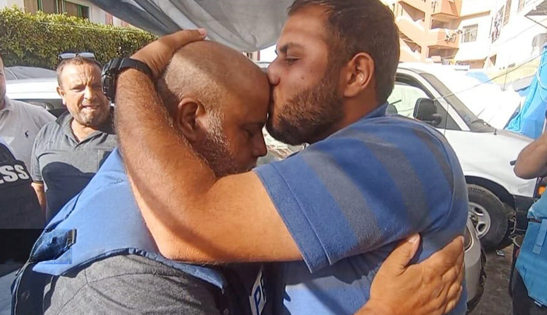 الزميل وائل الدحدوح يودع نجله حمزة بعد استشهاده في قصف إسرائيلي استهدف صحفيين غرب خان يونس جنوبي #قطاع_غزة