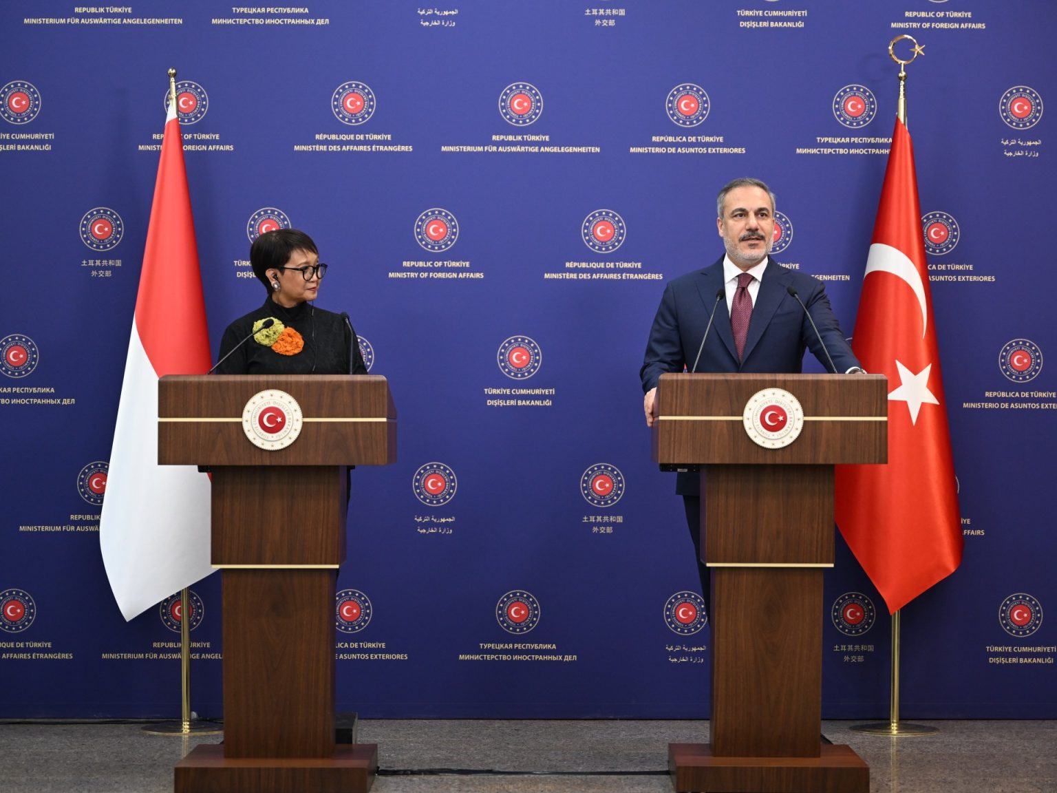 وفي مؤتمر صحفي مع نظيرته الإندونيسية ريتنو مارسودي بأنقرة أشار فيدان إلى أنه لمس خلال مباحثاته في العاصمة السعودية الرياض مع الدول التي تعترف بفلسطين -خاصة ضمن منظمة التعاون الإسلامي ودول الجامعة العربية- أن بعضها مستعد لاتخاذ موقف بشأن دعوى الإبادة الجماعية ضد إسرائيل لدى محكمة العدل الدولية، مشيرا إلى أن نيكاراغوا وكولومبيا اتخذتا موقفا ملموسا بشأن القضية.