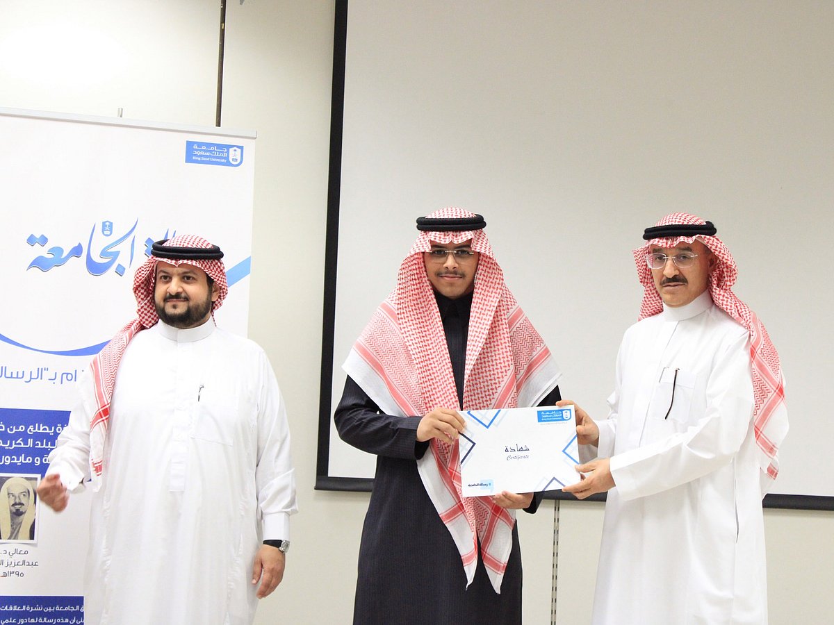 برعاية وحضور عميد كلية العلوم الإنسانية والاجتماعية بجامعة الملك سعود، سعادة الدكتور عبدالوهاب بن محمد ابا الخيل، أُقامت صحيفة رسالة الجامعة حفل تكريم لأكثر من 30 طالبًا وطالبة من المتدربين المتميزين في صحيفة رسالة الجامعة، وذلك تقديرًا لجهودهم وإنجازاتهم خلال فترة التدريب.