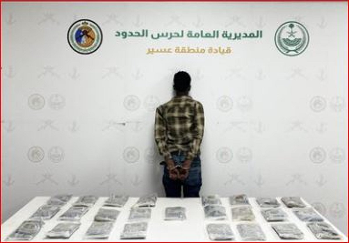 قبضت الدوريات البرية لحرس الحدود في قطاع الربوعة بمنطقة عسير على مخالف لنظام أمن الحدود من الجنسية الإثيوبية، لتهريبه (28) كيلوجرامًا من مادة الحشيش المخدر، وجرى استكمال الإجراءات النظامية الأولية بحقه، وتسليمه والمضبوطات لجهة الاختصاص.