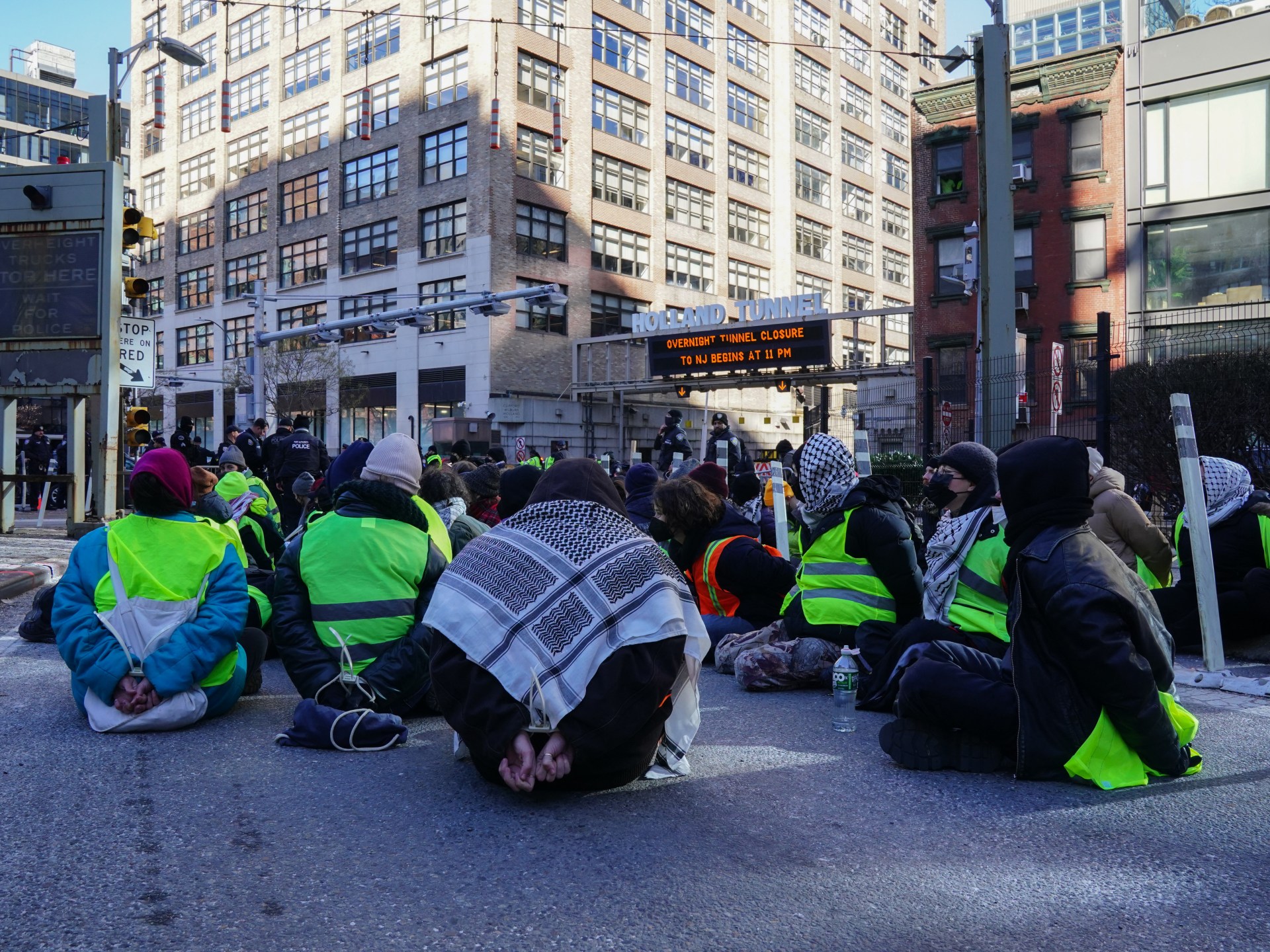 أغلق عشرات المتظاهرين المؤيدين للفلسطينيين 3 جسور حيوية ونفقا يربط مانهاتن ببقية نيويورك والمناطق المحيطة بها، أمس الاثنين، في تحرك منسق احتجاجا على العدوان الإسرائيلي على قطاع غزة.