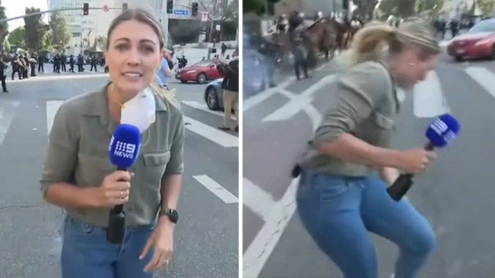 أُصيبت مراسلة لقناة إخبارية أسترالية برصاصة مطاطية على الهواء مباشرة أثناء تغطيتها احتجاجات الهجرة يوم الأحد في وسط مدينة لوس أنجلوس.