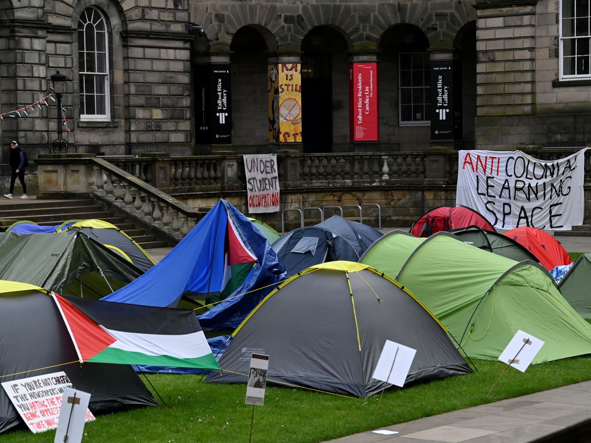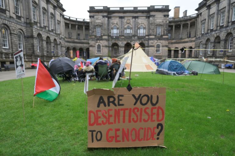استيقظت آرلو الفتاة العشرينية الشقراء بعد أن تسللت أضواء الصباح إلى خيمتها المنصوبة في باحة الكلية القديمة بجامعة إدنبرة في قلب العاصمة الأسكتلندية. لم تكن الساعة قد تجاوزت الرابعة والنصف صباحًا، لكن الآن هو موعد شروق الشمس التي لم يختف ضوؤها في اليوم السابق إلا بعد العاشرة مساءً في هذا الجزء من شمال الكرة الأرضية. لم تكن الشمس فحسب هي التي أيقظت آرلو، بل الجوع أيضًا. فالطالبة التي تدرس الفلسفة وعلم اللاهوت لم تأكل منذ ثلاثة أيام، فهي تخيم أمام كلية القانون منذ ثلاثة أسابيع، وتضرب عن الطعام للمرة الثانية احتجاجًا على حرب الإبادة الإسرائيلية على قطاع غزة.