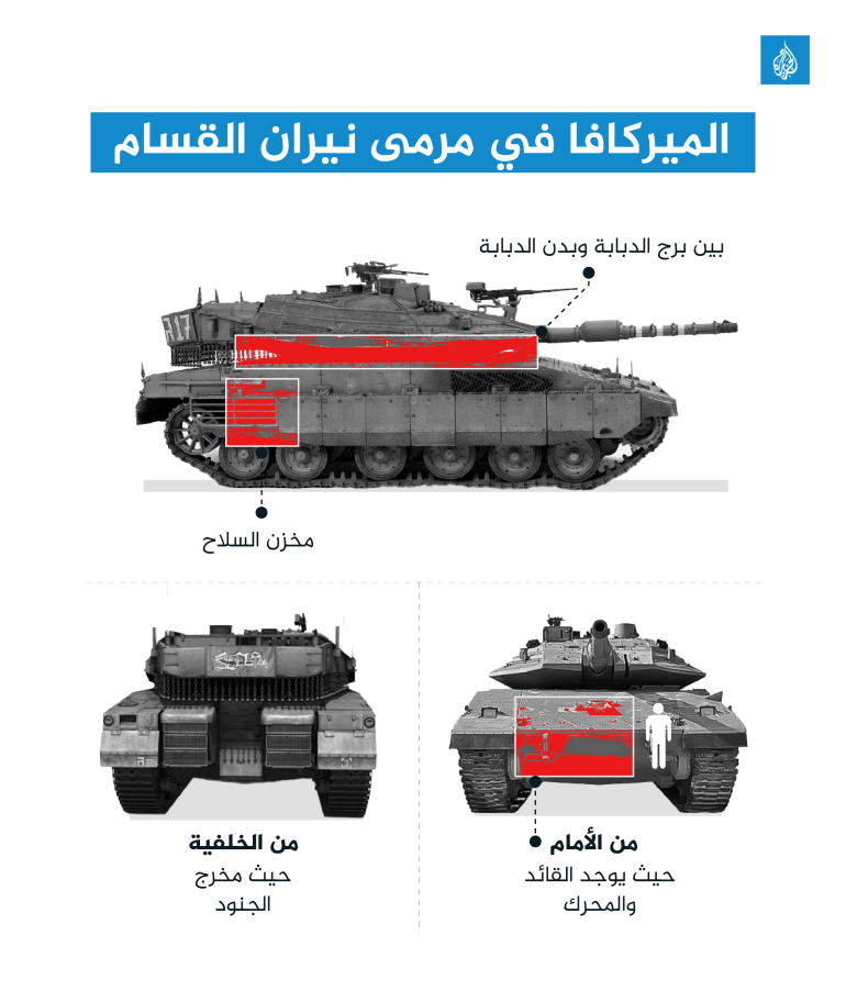 يتجلى ذلك في فيديوهات القسام التي تصدر يومًا بعد آخر، حيث يُستهدف الجنود بشكل أساسي عبر ثلاثة نقاط قاتلة، أولها نقطة المحرك في مقدمة الدبابة وبالتالي ضربها من الأمام يعرضها للتوقف عن العمل، وربما تصل نيران الفدائي إلى قائد الدبابة الذي يجلس إلى جوار المحرك. الثانية توجيه ضربة إلى خلفية الدبابة (المكان الذي يخرج منه الجنود) وإصابة من بالداخل، خاصةً مع احتوائه على مخزن الذخيرة. والثالثة وهي النقطة الفاصلة بين برج الدبابة الذي يحتوي على المدفع الرئيسي وبدن الدبابة. كانت كل هذه النقاط في مرمى قذائف المقاومة. في الصور التي تنتشر على وسائل التواصل لدبابات الميركافا المحطمة، غالبًا ما تظهر الإصابات في واحدة على الأقل من هذه المناطق الثلاث.