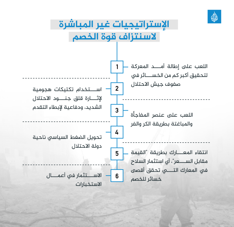 كيف أمكن في المقابل لكتائب القسام، التي تمتلك عددًا من الجنود قد يتجاوز بالكاد 5٪ من عدد جنود جيش الاحتلال، بلا دبابات أو طائرات، مع كم أقل من كل أنواع السلاح، أن تقف بثبات ضد تلك الحملة لكل تلك الفترة؟ أجبنا جزئيا عن هذا السؤال عبر ما مضى من نقاط تتعلق بدور الاستخبارات وكيفية انتقاء السلاح ومن ثم انتاجه محليا وكيفية ادارة المعارك المشتركة، لكن إذا تأملنا المعركة من عين الطائر، فإننا سنرى شيئًا اضافيًا يتعلق بإدارة المعركة ذاتها على مستوى أوسع، وهنا سنلتقي بالاستراتيجية غير المباشرة في الحرب، أي تلك الخطوات التي تتخذها قوة ما للحصول على نتيجة بطرق أخرى غير الحسم العسكري.