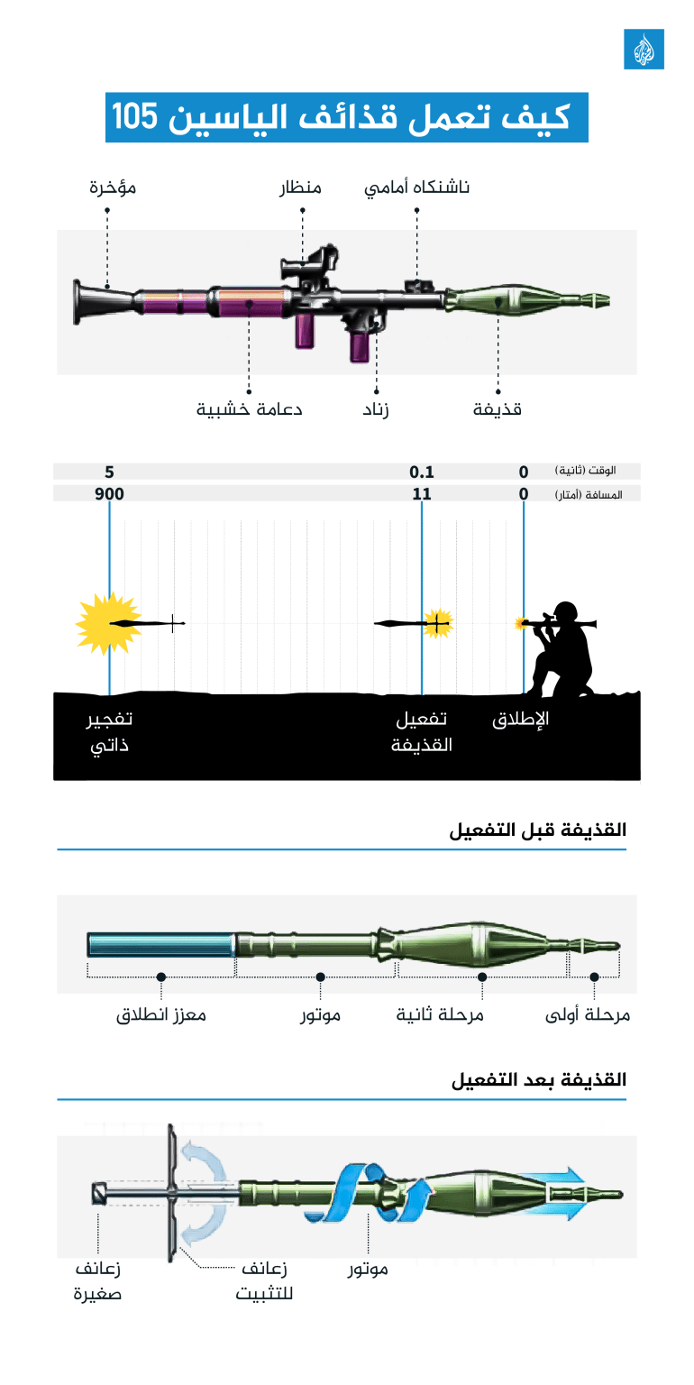 وبخلاف الكورنيت، ظهر سلاح جديد منذ عملية طوفان الأقصى انضم إلى ترسانة المقاومة متمثلا في قذائف الياسين من عيار 105 ملم، وهي رأس حربي ترادفي، بمعنى أنه يمتلك مرحلتين من التفجير، الأولى: عبارة عن شحنة متفجرة صغيرة تهدف إلى تنشيط الدرع التفاعلي للهدف، وهو نوع من الدروع التي تنفجر للخارج لمواجهة القذيفة القادمة فيتمكن من توجيه كامل قوتها الانفجارية إلى الخارج وليس إلى داخل الدبابة أو العربة المدرعة. أما المرحلة الثانية: فهي عبارة عن شحنة متفجرة أكبر تتبع الأولى، وتستغل الاختراق أو الفجوة التي حدثت في الدرع التفاعلي، ثم تفرغ كامل قوتها إلى داخل العربة المدرعة أو الدبابة.