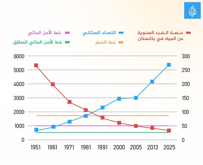 غير أن ارتفاع الاحتياجات الاقتصادية والشعبية في الهند دفعها إلى التوسع في بناء مشاريع الري والطاقة لتلبية احتياجاتها مع مرور الوقت، بالتزامن مع ما تواجهه باكستان من تحديات لأجل توفير مياه شرب نظيفة تتناسب مع ارتفاع التعداد السكاني، حيث يحصل نحو 36% فقط من إجمالي سكان باكستان على مياه صالحة للشرب والاستخدام. ويظهر في الرسم التالي كيف تراجعت حصة الفرد السنوية من المياه تدريجيا طيلة نصف القرن العشرين في باكستان مع تنامي التعداد السكاني، إذ أن البلاد دخلت منطقة الخطر في الثمانينيات، ثم انتقلت إلى ما دون خط الأمن المائي (أقل من 1000 متر مكعب للشخص سنويا) في العقد الأول من القرن الحادي والعشرين.