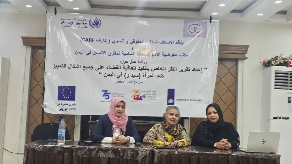 بدعم من مكتب المفوضية العام للأمم المتحدة لحقوق الإنسان في اليمن، نظم الائتلاف المدني والحقوقي (كارف) اليوم (الأحد)، في العاصمة المؤقتة عدن، ورشة لمناقشة ومراجعة المسودة الأولى لتقرير الظل الخاص بتنفيذ اتفاقية القضاء على جميع أشكال التمييز ضد المرأة، الذي تعكف على إعداده المنظمات النسوية والحقوقية المنضوية في ائتلاف كارف.