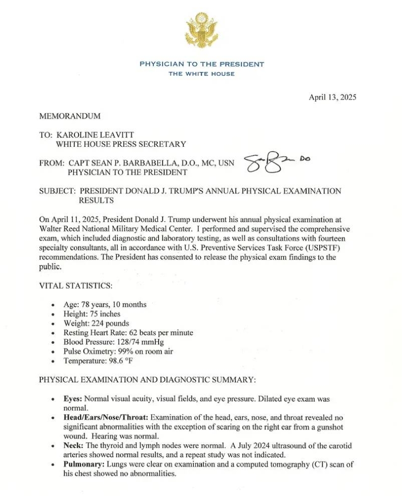 وأظهر تقرير صادر عن أطباء الرئاسة، وزعه البيت الأبيض، الرئيس ترمب في صحة إدراكية وجسدية ممتازة، وهو مؤهل بالكامل لتأدية مهماته كقائد أعلى ورئيس للبلاد. وقال طبيب ترمب، شون باربابيلا إن الرئيس الأمريكي لا يزال يتمتع بصحة ممتازة. وصدر التقرير بعد مرور يومين على خضوع ترمب لفحص طبي روتيني يوم الجمعة. ويعد هذا التقرير الأكثر تفصيلاً حول صحة ترمب، البالغ من العمر 78 عاماً، منذ عودته إلى البيت الأبيض في 20 يناير الماضي كأكبر رئيس أمريكي سناً. وكتب باربابيلا في تقريره: «يتمتع الرئيس ترمب بصحة بدنية وذهنية ممتازة، وهو لائق تماماً لأداء واجبات القائد الأعلى ورئيس الدولة».
