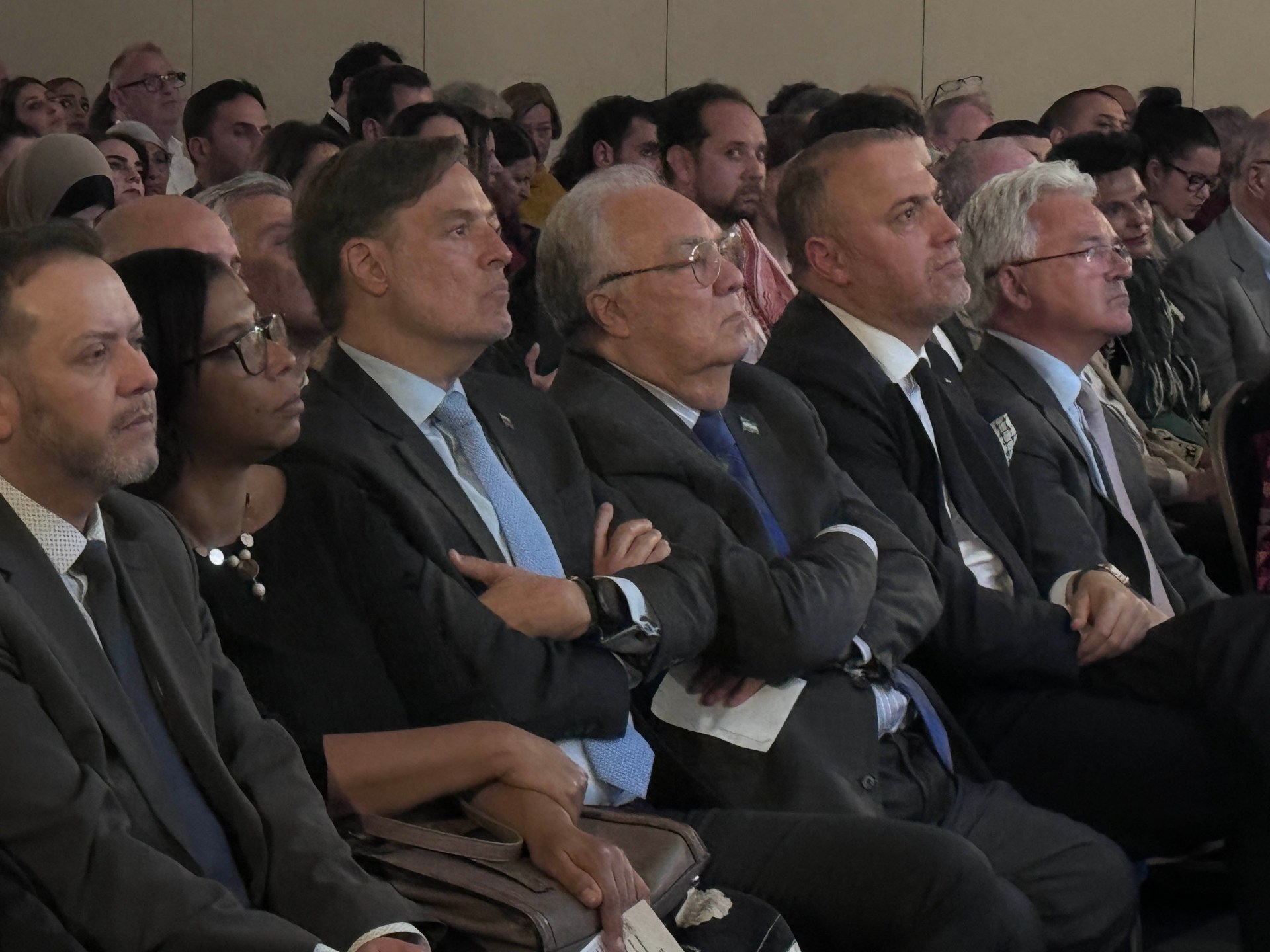 وأضاف زملط أن هذه القاعة احتضنت أول جمعية عمومية للأمم المتحدة، وأنه من الضروري إعطاء منبر لشهود النكبة، بما في ذلك الشاهدون عليها على غرار الجراح البريطاني من أصل فلسطيني غسان أبو ستة الذي حضر الحفل، والناشط ابن غزة معتز عزايزة.