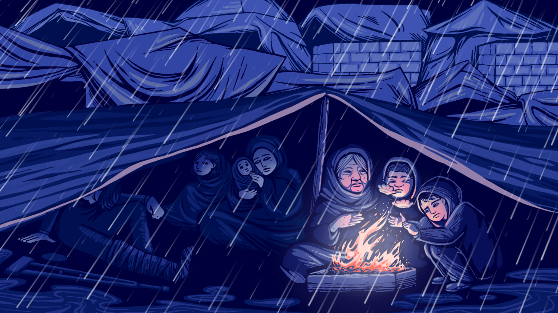 ويكافح الزوجان لتدفئة مولدتيهما داخل الخيمة التي أجبرهم التهجير القسري على اللجوء إليها في ظروف مناخية قاسية ومن دون ملابس أو أغطية. علما أنهما لن يتمكنا من نقلها إلى الخارج قرب النار التي يشعلها النازحون بجوار الخيمة طلبا للدفء، لأن الدخان يسبب لها صعوبة في التنفس.