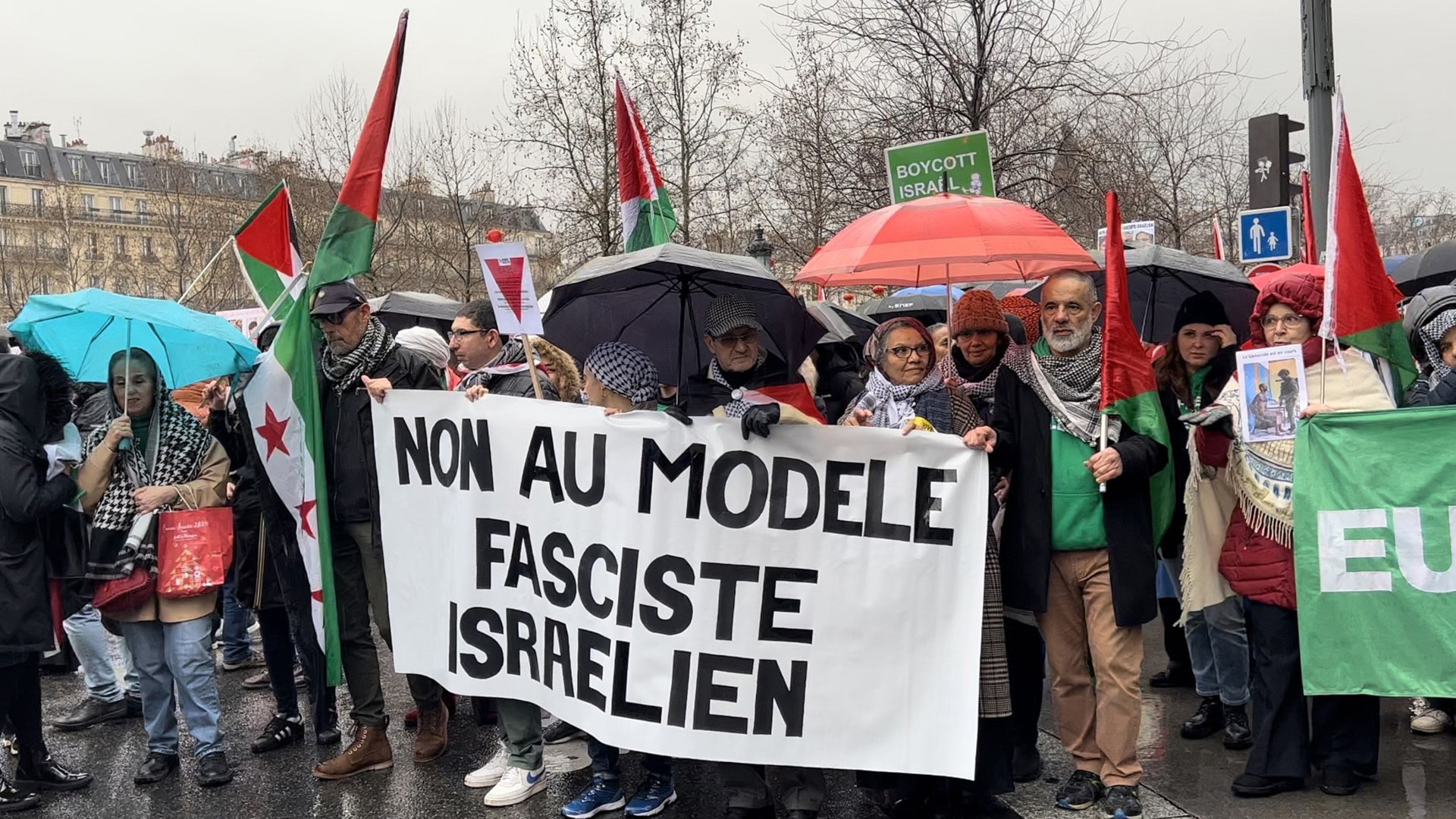 في المقابل، هتف المشاركون في المظاهرة الحاشدة ضد تصاعد اليمين المتطرف الذي انقض على دوائر الحكم في فرنسا بأفكاره المعادية للمهاجرين، وإدانة تواطؤ حكومة الرئيس إيمانويل ماكرون مع اليمين الإسرائيلي المتطرف.