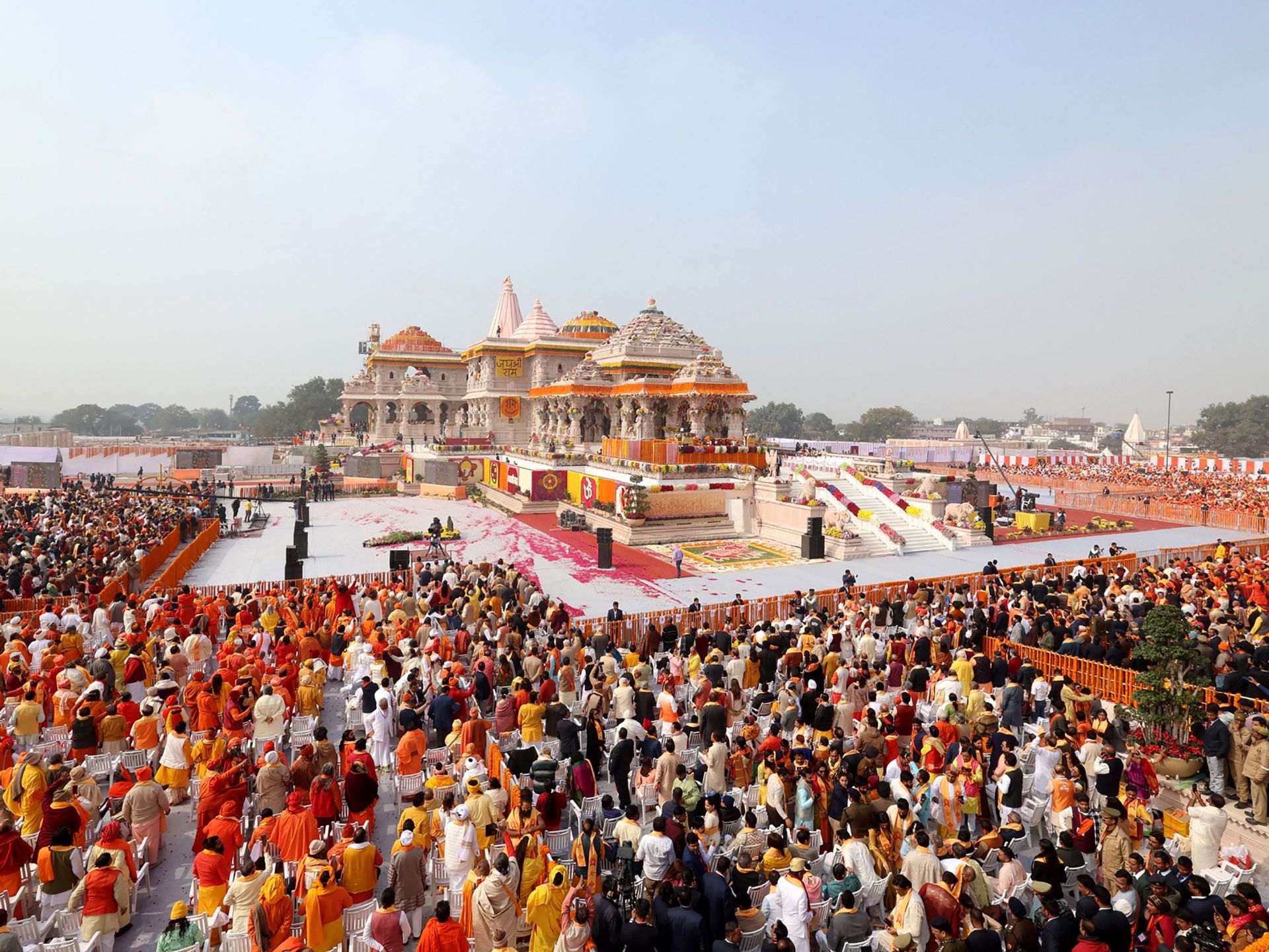 وتدفق المصلون المبتهجون من جميع أنحاء البلاد للاحتفال بالافتتاح، حيث رقصت مجموعات منهم على أنغام الأغاني الدينية التي تنطلق من مكبرات الصوت على الطرق المزينة بالزهور. وتم وضع مجسمات ضخمة للورد رام واللوحات الإعلانية لمودي في كل مكان في جميع أنحاء أيوديا، وتم إغلاق الحدود لمنع مزيد من الناس من الدخول في ظل نشر نحو 20 ألف رجل أمن وأكثر من 10 آلاف كاميرا أمنية.