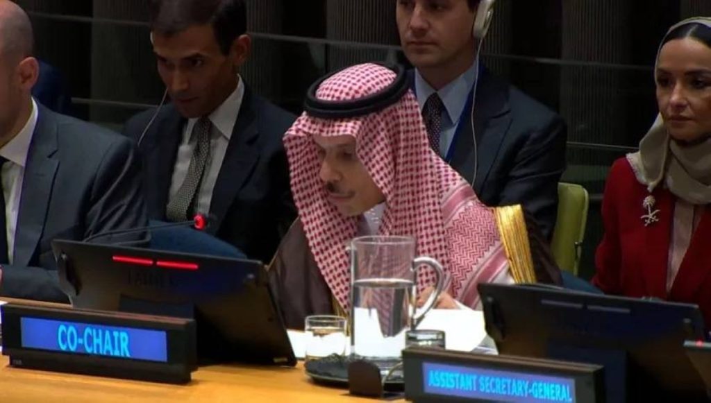 وقال وزير الخارجية الأمير فيصل بن فرحان، في كلمته، إن السعودية تؤمن بأن تحقيق الأمن والازدهار في المنطقة يبدأ من إنصاف الشعب الفلسطيني، ونيله حقوقه المشروعة، وفي مقدمتها إقامة دولة فلسطينية على حدود 1967 وعاصمتها القدس الشرقية، موضحاً أن مؤتمر نيويورك محطة مفصلية نحو تنفيذ حل الدولتين.