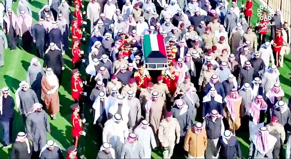 وحُمل نعش الأمير، الذي رحل أمس الأول (السبت) عن 86 عاماً، على الأكتاف وقد لُفّ بعلم الكويت في مراسم تقدّمها خلفه الشيخ مشعل الأحمد الجابر الصباح. واقتصرت المراسم على أفراد الأسرة الحاكمة، وجرت بعد إقامة صلاة الجنازة في مسجد بلال بن رباح.