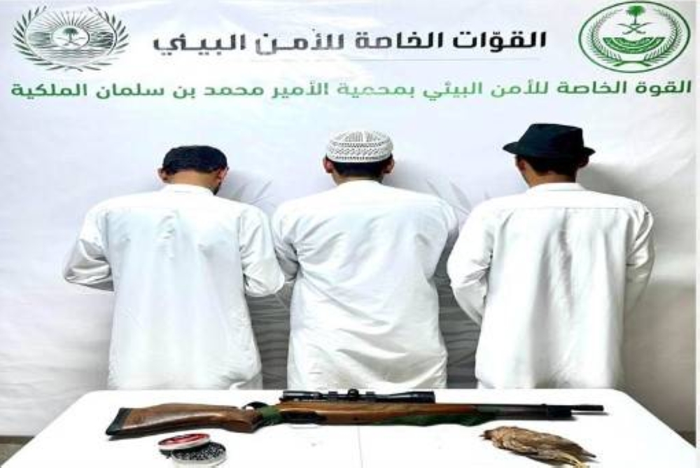 صرح المتحدث باسم القوات الخاصة للأمن البيئي بأن الدوريات الميدانية للقوات وهي تؤدي مهماتها في تنفيذ نظام البيئة تمكنت من القبض على المواطنين: يوسف عتيق العميري، وريان أحمد العميري، وعبدالعزيز عتيق الحويطي؛ لارتكابهم مخالفة الصيد دون ترخيص وبحوزتهم بندقية هوائية، و(42) طلقة هوائية حيّة، وطير مصيد، وجرى اتخاذ الإجراءات النظامية بحقهم، وإحالتهم إلى الجهة المختصة.