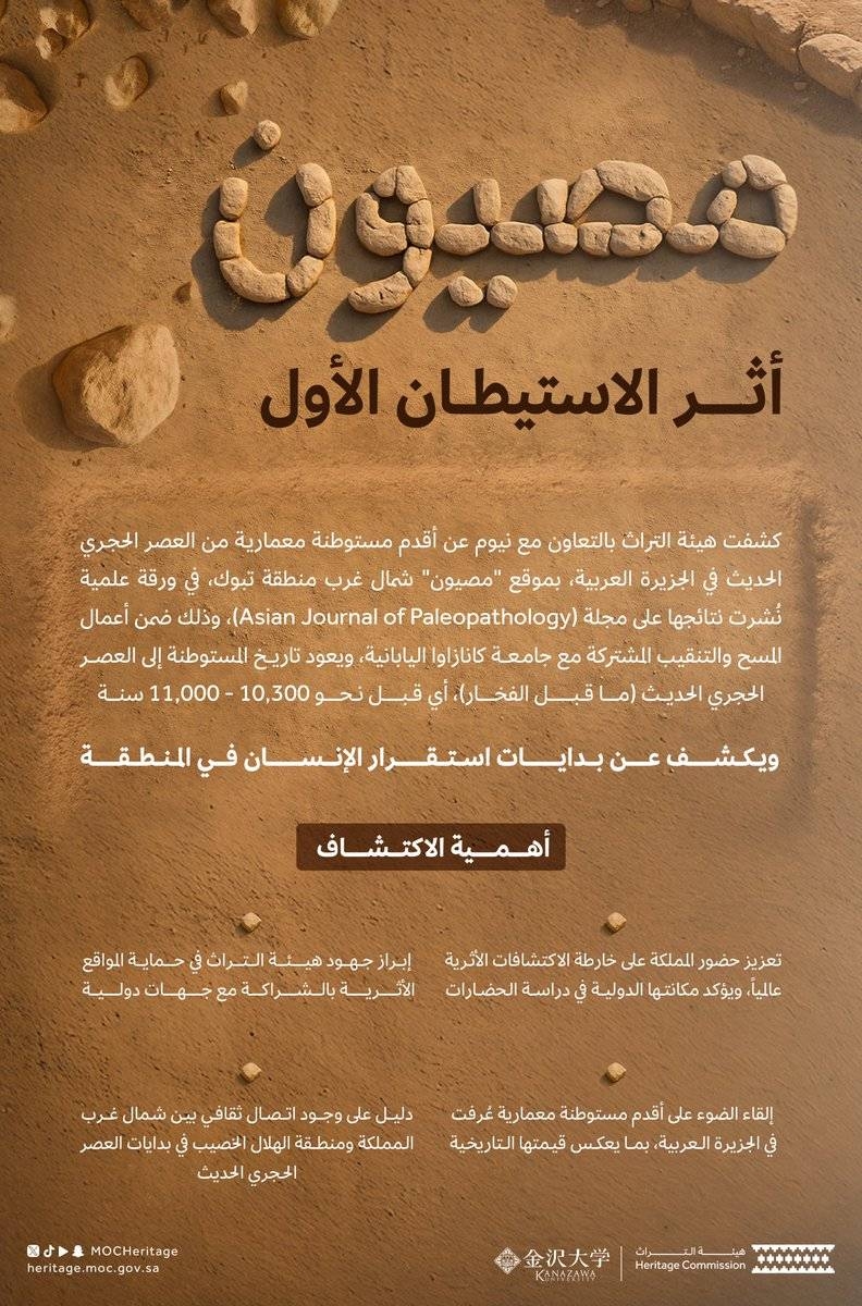 أعلن وزير الثقافة رئيس مجلس إدارة هيئة التراث الأمير بدر بن عبدالله بن فرحان ، عن اكتشاف أقدم مستوطنة معمارية في الجزيرة العربية، وذلك ضمن أعمال التنقيب الأثري التي تنفذها الهيئة بالشراكة مع جامعة “كانازاوا” اليابانية، وبالتعاون مع نيوم في موقع “مصيون” شمال غرب مدينة تبوك، ويعود تاريخ المستوطنة إلى العصر الحجري الحديث ما قبل الفخار، وتحديدًا إلى الفترة بين 11000 و10300 سنة من الوقت الحاضر.