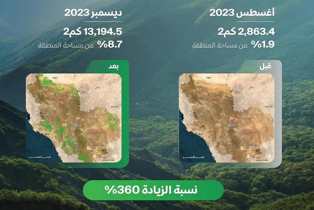 كشف المركز الوطني لتنمية الغطاء النباتي ومكافحة التصحر، زيادة مساحات الغطاء النباتي في منطقة المدينة المنورة بنسبة بلغت 360% خلال الأشهر الخمسة الماضية من عام 2023، بدايةً من أغسطس وحتى ديسمبر، بسبب هطول الأمطار في هذه الفترة.