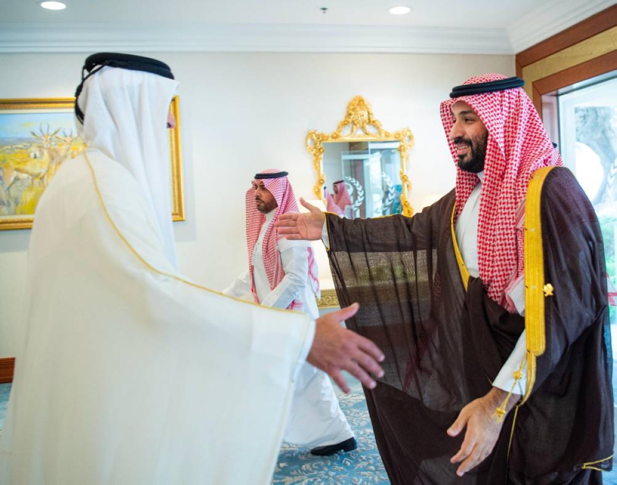 وكان في استقبال ولي العهد لدى وصوله مقر انعقاد الدورة الاستثنائية للمجلس الأعلى لمجلس التعاون لدول الخليج العربية، والقمة العربية الإسلامية الطارئة في العاصمة القطرية الدوحة، صاحب السمو الشيخ تميم بن حمد آل ثاني أمير دولة قطر.
