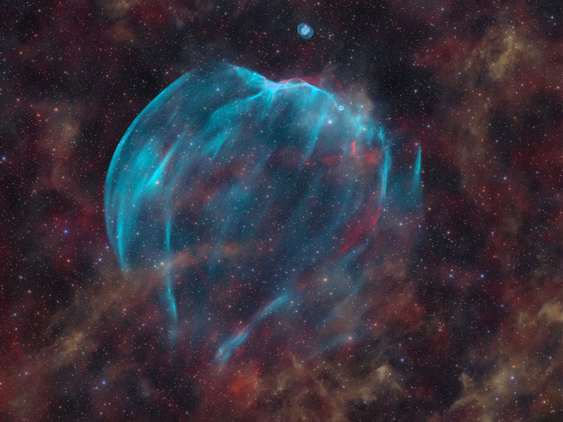 والاكتشاف عبارة عن بقايا مستعر أعظم عملاق (ما تبقى من نجم انفجر قديما قبل آلاف أو مئات الآلاف من السنين) صُوّر وحُلل وتأكد من وجوده فريق من علماء الفلك الهواة والمحترفين. وتقع بقايا هذا المستعر الأعظم في موقع غير متوقع على الإطلاق؛ في منتصف المسافة بين “ميسييه 42″ و”سديم الوردة” في كوكبة أوريون.
