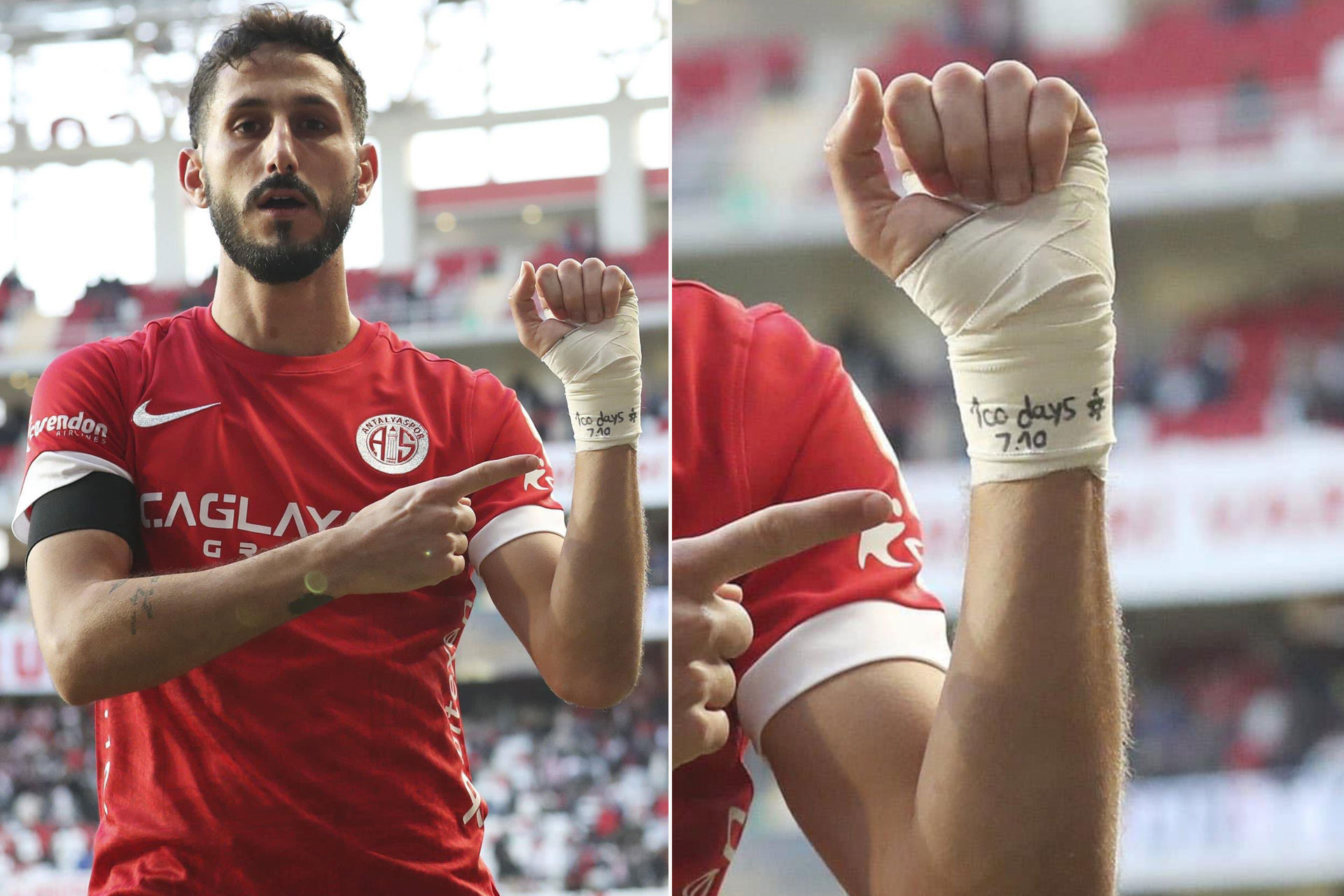 واحتفل اللاعب بكتابة رقم 100 على معصمه بعد تسجيله هدف المباراة، في تلميح إلى مرور 100 يوم على بداية العدوان الإسرائيلي على غزة.