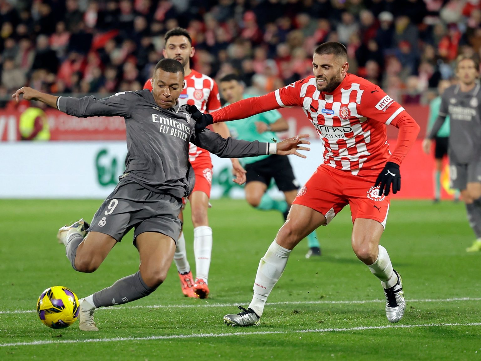 وخطف مبابي الكرة بيده من أمام أحد المدافعين في الدقيقة 47، وانطلق بها من منتصف الملعب لينفرد بباولو غازانيغا حارس جيرونا، لكنه وضعها خارج إطار المرمى، وبعدها أطلق الحكم مانزانو صافرته معلنا لمسة يد على مهاجم ريال مدريد.