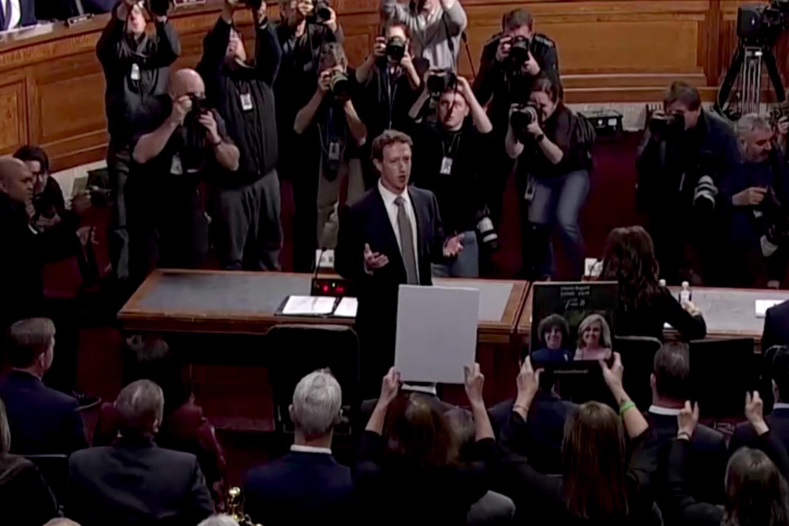 وتحت حث من السيناتور الجمهوري جوش هاولي، وقف زوكربيرغ وخاطب العائلات التي رفعت صور أطفالها الذين قالوا إنهم تعرضوا للأذى من قبل وسائل التواصل الاجتماعي.
